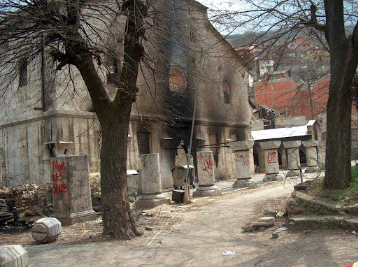La cathédrale Saint-Georges au lendemain des pogroms anti-serbes de mars 2004. Sur ce qui reste des piliers de l'auvent monumental, l'inscription "Mort aux Serbes".Prizren a été en 2004 l'une des villes où les pogroms anti-serbes ont été les plus violents. En deux jours, tout le quartier serbe de la ville a été incendié, le séminaire orthodoxe ravagé par les flammes, la cathédrale Saint-Georges détruite. Les derniers Serbes de la ville ont tous fuit, à l'exception d'une dizaine de familles. Quant à l'église de la Vierge de Ljevis, elle a elle aussi été incendiée : aujourd'hui encore, une épaisse suie noire recouvre par endroits ses fresques vieilles de sept siècles. Et ses cloches, qui ne sonnaient plus depuis 1999, avaient été jetées du haut de leur clocher.