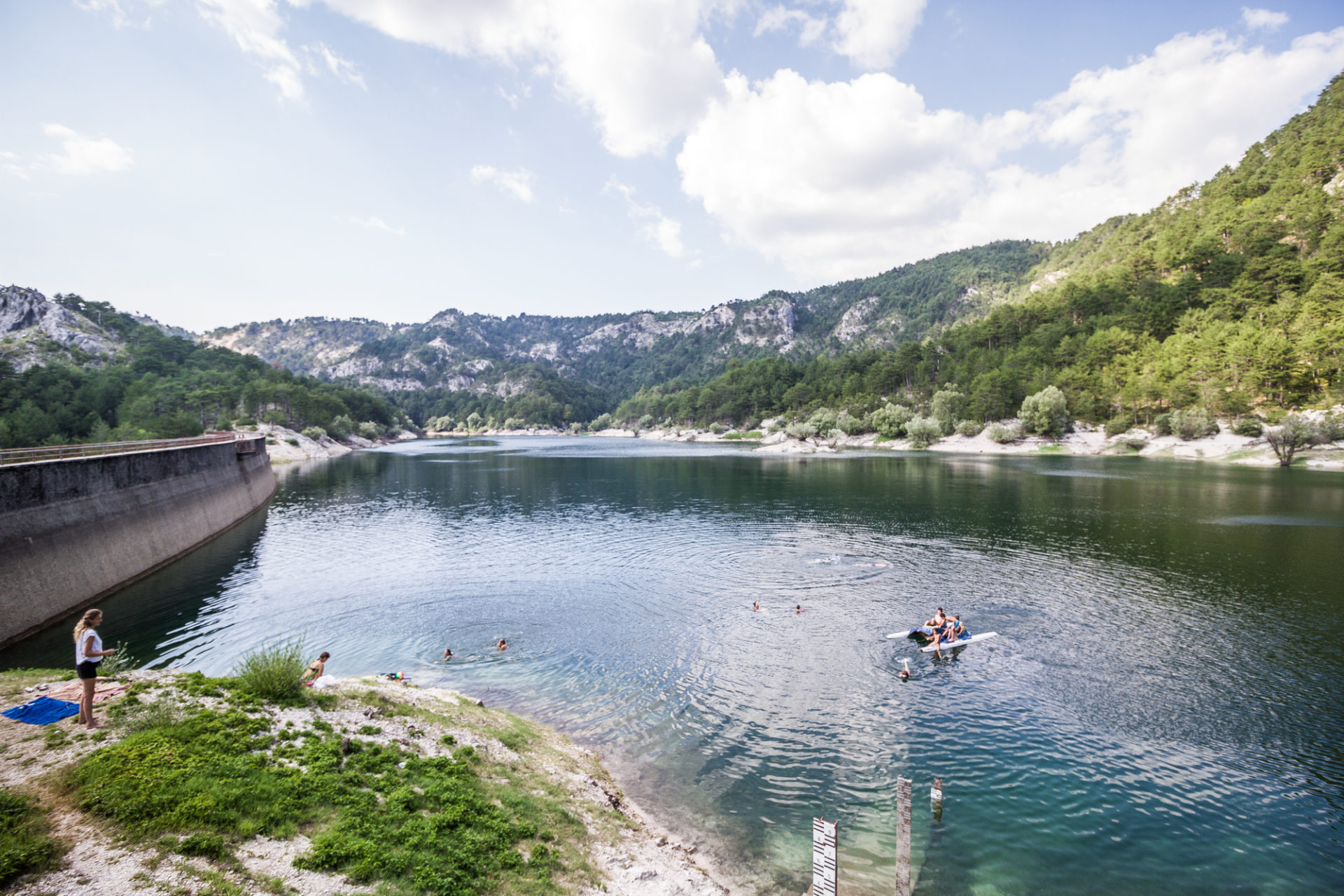Après une dizaine de minutes de marche sur le chemin qui grimpait entre les arbres, nous sommes arrivés soudainement au bord d'un lac. D'un côté, un grand barrage en arc de cercle, partout ailleurs des rochers décharnés lancés vers le ciel. Et sur l'eau transparente du lac, un vieux pédalo dont on se demande encore comment il a pu arriver là. Une famille était déjà là, qui nous attendait : une table était dressée, couverte de bouteilles de jus de fruit, et sur un barbecue grillaient quelques pièces de viande pour le goûter. L'odeur de la viande cuite se mélangeait à celle de la résine chaude, l'ensemble étant adouci par la fraîcheur montant de l'eau. Dans les pins et les herbes, les grillons chantaient les louanges du soleil.
