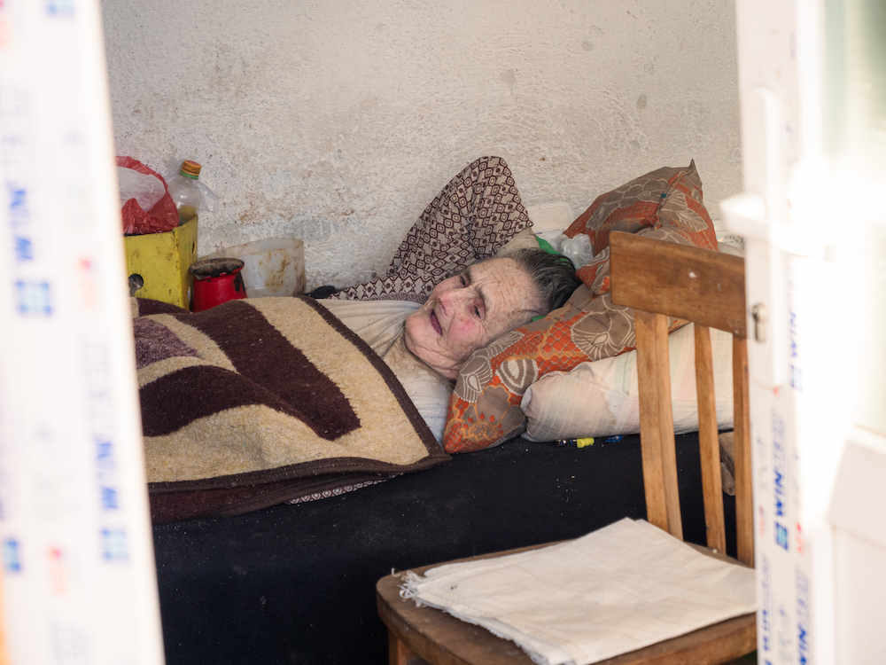 Au bout de ce chemin de terre, la misère absolue. Une vieille femme, couchée sur un lit fait de planches de bois, privée de tout...Le Père Stevo, curé de Novo Brdo qui nous guide aujourd’hui, nous regroupe autour de lui : « Ici, c’est particulièrement difficile, ce sont des gens très pauvres, ils n’ont presque rien. Nous avons pu leur installer des fenêtres au début de l’hiver : depuis des années, seuls des grands plastiques et des vieilles couvertures les séparaient du froid de dehors ». Au moment où il ouvre la porte, une odeur très forte nous agresse, malgré le vent froid. Dans la seule pièce, minuscule, de la maison, une vieille femme allongée sur un lit fait de palettes. Alitée depuis des années, elle vit avec son fils qui s’occupe d’elle comme il peut. Il n’est pas là aujourd’hui. Au bout de son lit, une télévision de fabrication yougoslave diffuse la dernière série à la mode. Le luxe tapageur des images qui éclairent les murs effrités de la pièce rend la misère de cette pauvre femme encore plus intolérable. Sous la télé, un vieux poêle peine à chauffer ce taudis. Nous en déposons un neuf devant sa porte : la dame nous assure que son fils saura s’en débrouiller. Au moment de partir, le Père lui demande de quoi elle manque le plus. Sa réponse jette un voile amer sur le visage des volontaires qui comprennent le serbe : « Des couches. Je n’en ai plus. » Alors que nous reprenons à l’envers le chemin qui nous a menés ici et qui sépare cette pauvre femme du reste du monde, l’ambiance dans les fourgons est morose. Un volontaire finit par murmurer : « Elle aurait pu être ma grand-mère… Comment peut-on la laisser là comme ça ? »