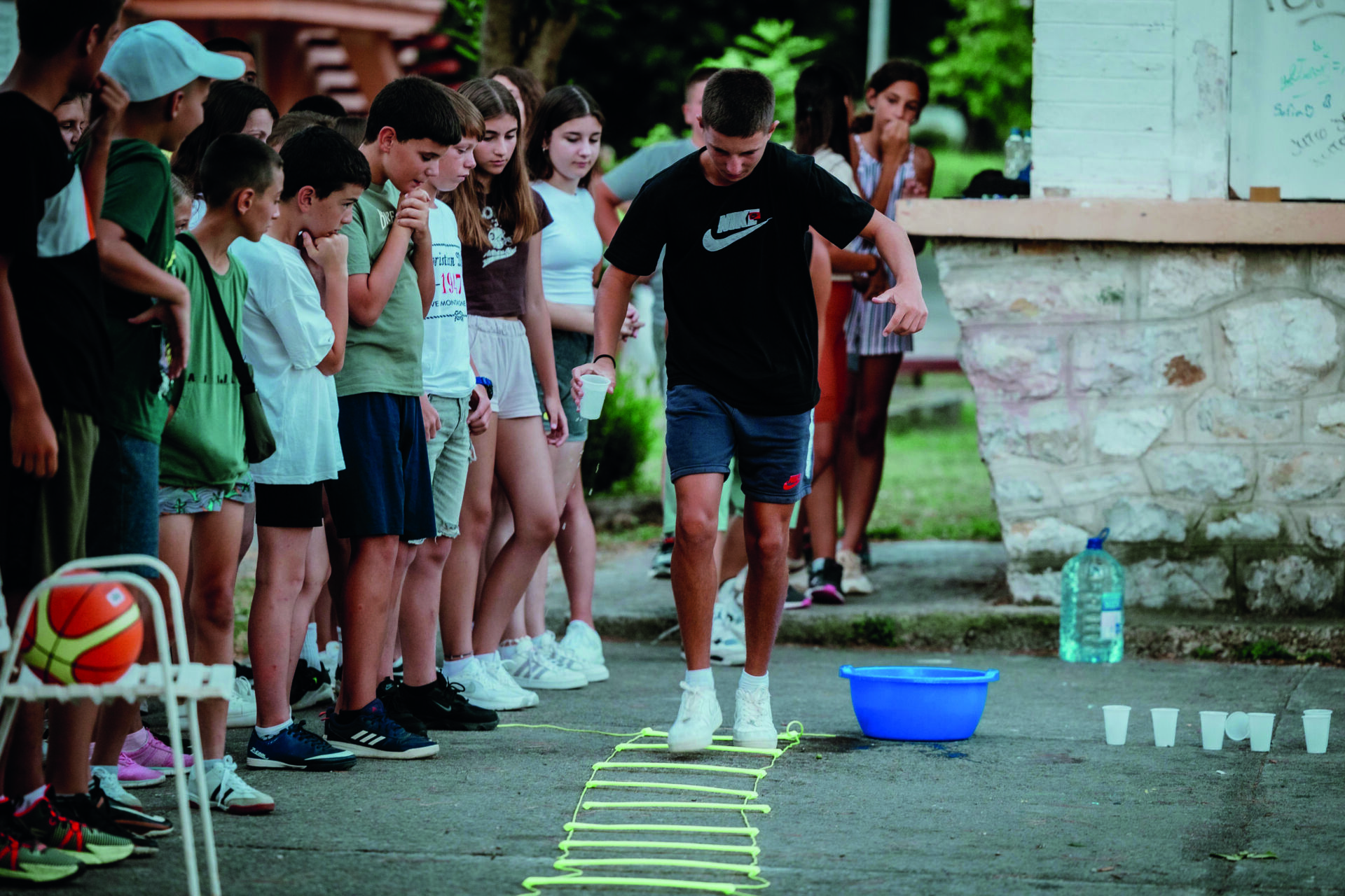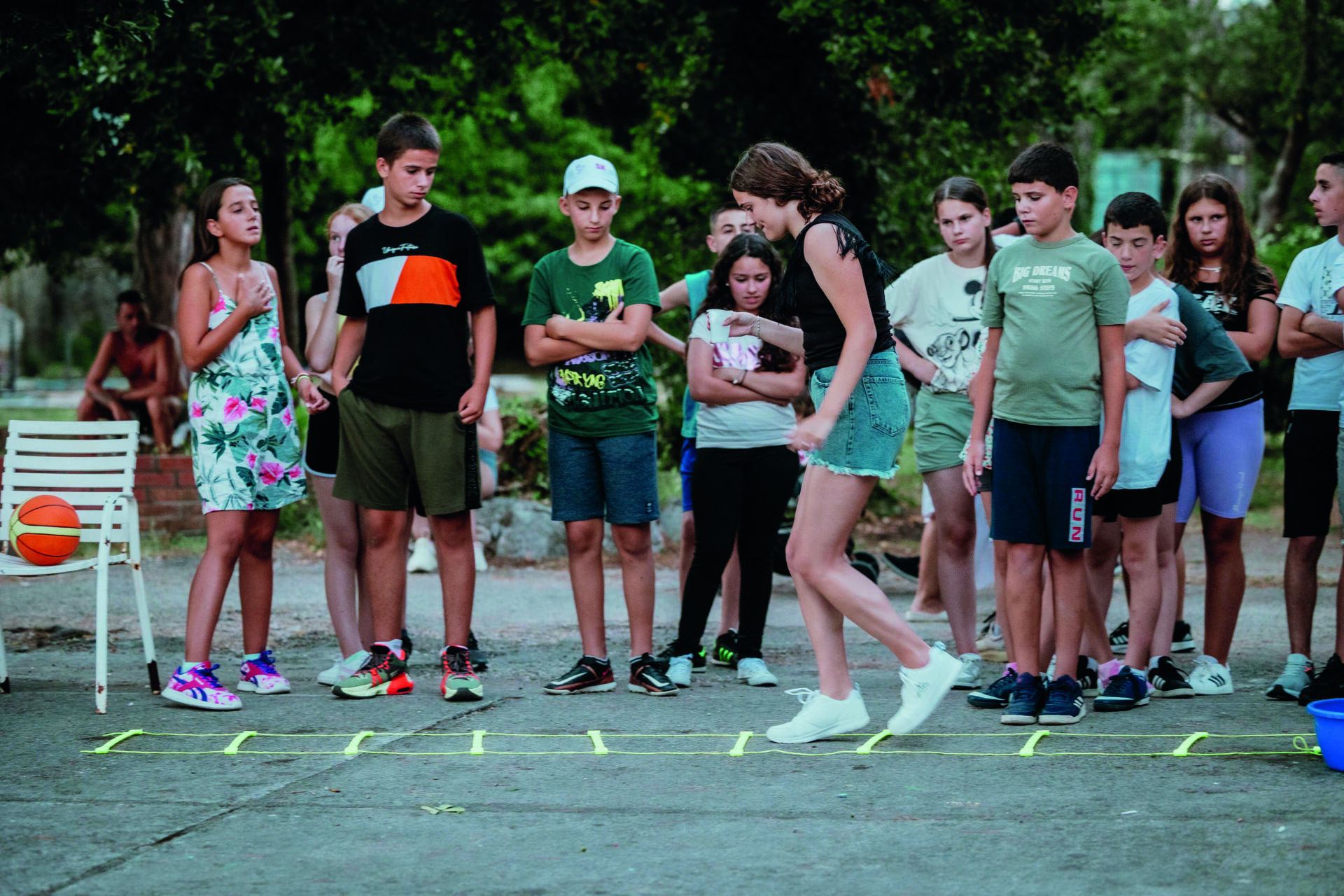 Chaque après-midi, dans un endroit ombragé qui leur est réservé, les enfants s’affrontent lors de défis sportifs : course d’obstacles, relais, balle au prisonnier, jeux de force ou d’adresse… Sous les encouragements de leurs coéquipiers, des enfants se mesurent chacun à leur tour aux différentes épreuves.