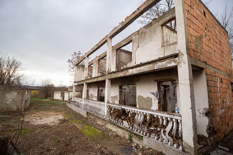 Un enfant de l'enclave d'Orahovac qui rentre chez lui les bras chargés de cadeaux apportés par nos volontaires passe devant l'une des nombreuses maisons en ruine qu'on peut voir dans ce petit quartier serbe.