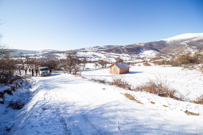 Au réveil, une autre surprise nous attend : pendant la nuit, les températures sont tombées largement en dessous de zéro. Avec la neige qui tombe par intermittence depuis le premier jour de distributions, ça annonce une journée compliquée. En effet, nous allons aujourd’hui parcourir la région de Novo Brdo : une succession de plusieurs enclaves réparties dans les montagnes à l’Est de Gracanica. Chaque année, cette partie du convoi est celle qui est le plus amenée à changer : les routes dans la région sont en mauvais état, de nombreuses enclaves ne sont joignables que par des chemins de terre défoncés. Avec la neige qui a gelé pendant la nuit, il ne fait aucun doute que certains de ces chemins seront impraticables, en tout cas avec nos fourgonnettes.