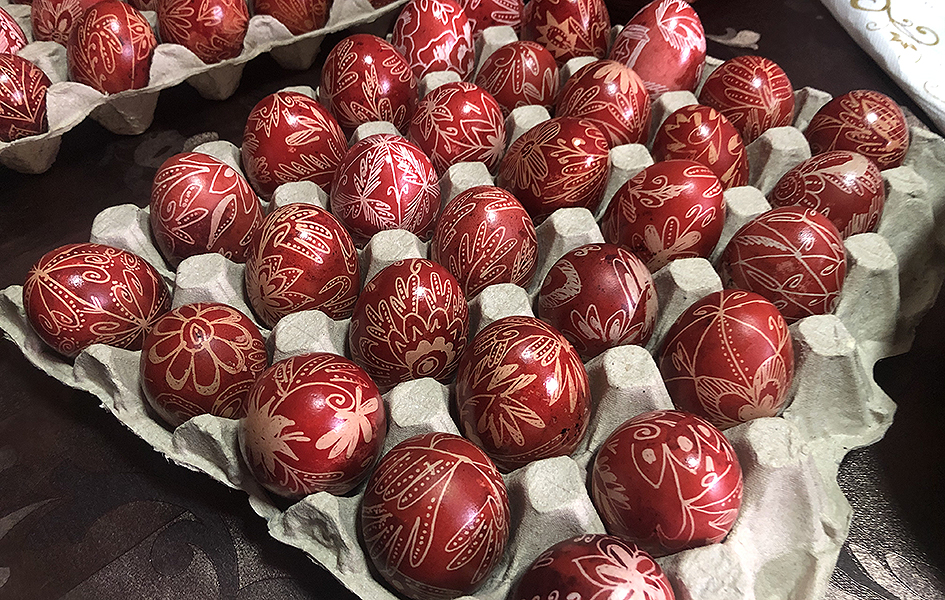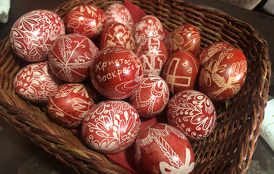 Autrefois, les œufs peints étaient le seul cadeau offert à Pâques. Aujourd’hui, ils accompagnent toujours les familles à l’église, nichés dans une jolie petite corbeille en osier, pour être bénis au terme de la liturgie pascale de quatre heures. A leur retour au foyer, certains œufs sont mangés à l’issue d’un jeu cocasse, le « duel d’œufs ». Lors du repas pascal, chaque membre de la famille choisit un œuf décoré puis, tour à tour, chacun à table essaie de casser l’œuf de son voisin avec trois doigts. Celui qui parvient à garder la coquille de son œuf intact est le gagnant du duel. L’œuf vainqueur est aussi considéré comme signe de chance pour son détenteur. Enfin, d’autres œufs sont uniquement destinés à décorer la table et la maison.