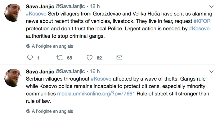 Dans deux messages postés sur Twitter le 22 novembre 2017, le Père Sava Janjic, higoumène (père abbé) du monastère orthodoxe de Visoki Decani, relaie les appels au secours de nombreux habitants serbes des enclaves chrétiennes du Kosovo, qui subissent depuis quelques jours une vague de vols.