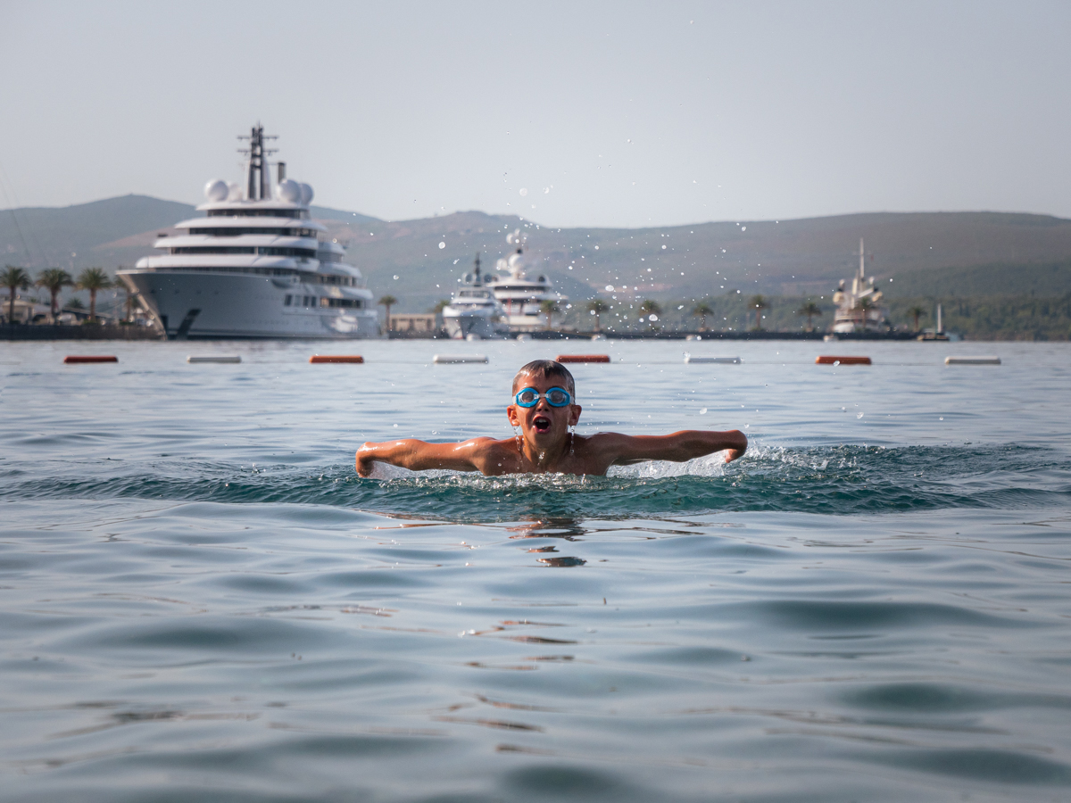 Le matin, après le petit-déjeuner, on file à une plage située à quelques centaines de mètres de l’hôtel. Située face à Porto Montenegro, quartier luxueux sorti de terre ces dernières années à l’emplacement de l’ancien port militaire de Tivat, elle permet une baignade agréable avec vue sur les yachts des richissimes visiteurs du quartier et les avions qui décollent de l’aéroport de Tivat. Le soleil frappant déjà fort dès 8 heures du matin, les arbres qui bordent la plage sont particulièrement appréciables et leur ombre est souvent mise à profit par les enfants, entre deux baignades.