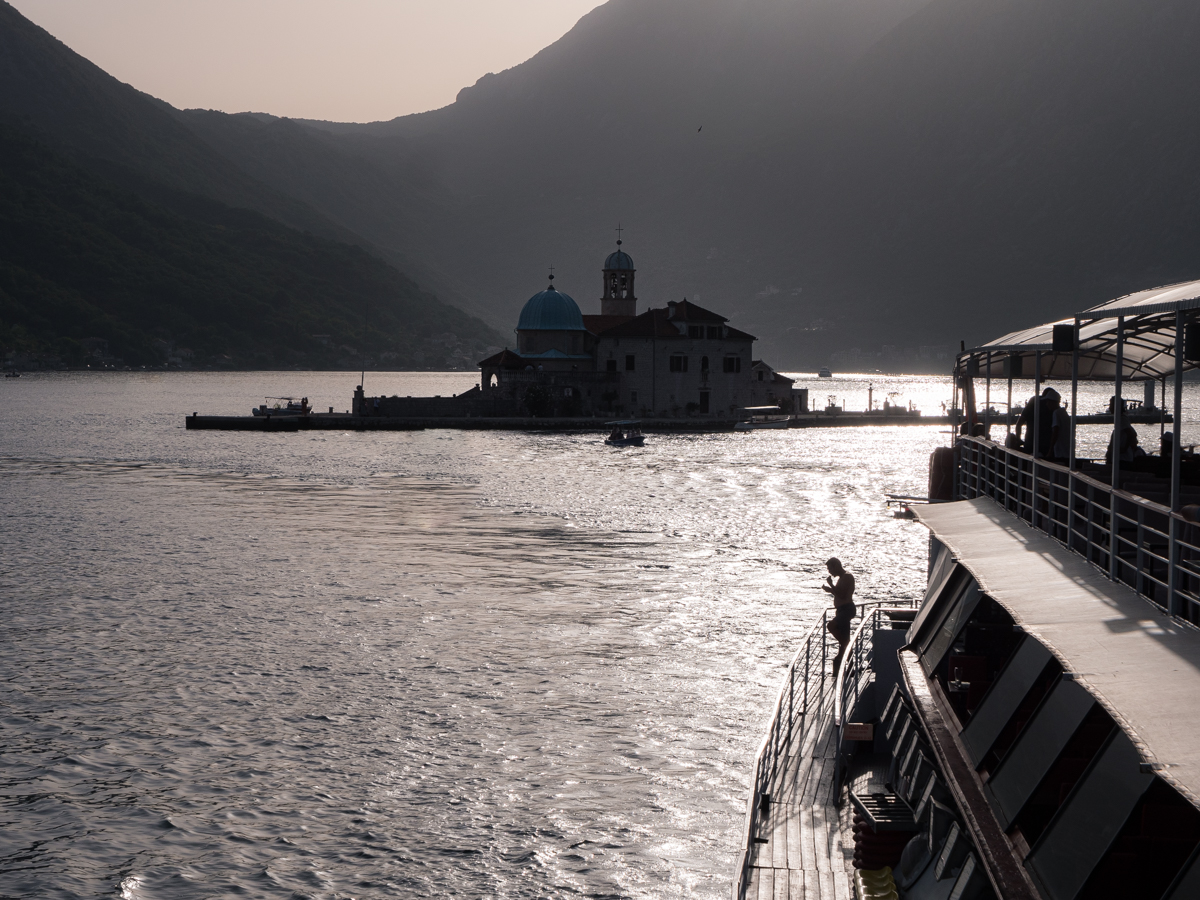 L’après-midi, nous avons tous embarqué sur un bateau-mouche venu tout droit de Paris, pour une virée sur la baie de Kotor. Une promenade qui est chaque année un des points forts du séjour : dans le ronronnement des moteurs, le vent apportant un rafraîchissement bienvenu, chacun profite des paysages magnifiques qui se succèdent sans discontinuer des deux côtés du navire. Aux pieds de montagnes immenses qui plongent directement dans la mer se blottissent des villages aux airs d’Italie ; sur des îles perdues au milieu des flots, des églises minuscules chantent la gloire de Dieu et le génie de l’homme. Sur le bateau, on ri, on chante, on admire en silence, on prend des photos, on emplit son cœur et sa mémoire d’images qu’on n’oubliera jamais.