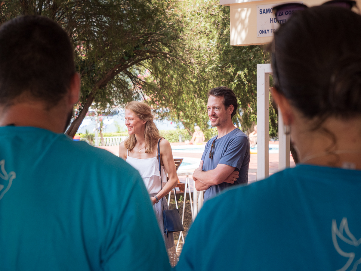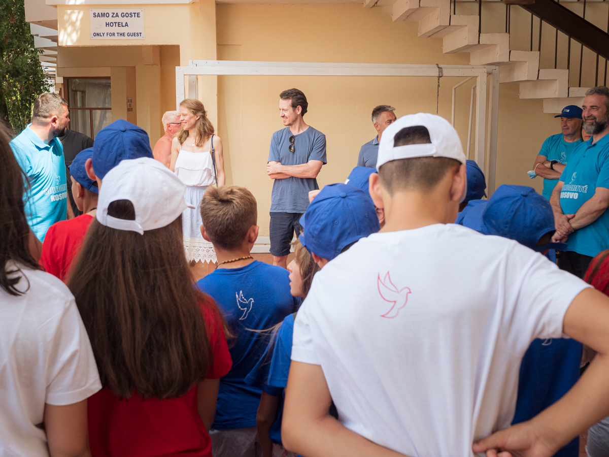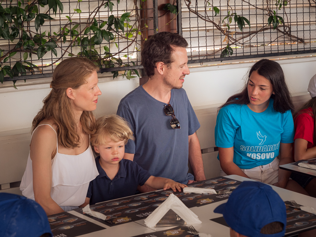 Le matin en effet, nous avons reçu la visite du Prince Filip Karadjordjevic, de la Princesse Danica et de leur fils le Prince Stefan. Le Prince Filip est le descendant direct de Georges Petrovic, surnommé « Karadjordje », « Georges le Noir », qui prit en 1804 la tête d’une insurrection contre l’Empire Ottoman. Son grand-père, Pierre II, était roi des Yougoslaves quand la deuxième Guerre mondiale éclata ; il fut déchu par les communistes de Tito après la victoire et reste donc à ce jour le dernier des rois serbes. En vacances au Monténégro pour quelques jours, le Prince a eu vent de notre présence avec des enfants du Kosovo et a tenu à bouleverser son programme pour venir nous rendre visite. Dans un bar du front de mer de Tivat, il a offert une boisson et un dessert à chaque enfant. Il nous a ensuite raconté sa récente visite à Prizren et à Pec, au Kosovo, et a remercié plusieurs fois l’équipe pour le travail accompli : « Ces enfants sont l’avenir, ce que vous faites pour eux est fondamental, ils ont tellement besoin de voir autre chose que leur quotidien qui est si difficile ».