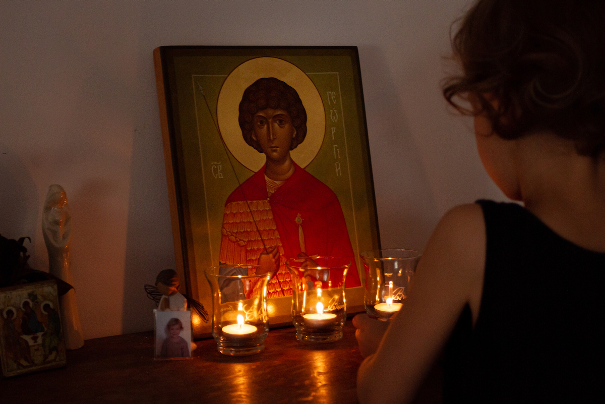L'icône de la famille Petrovic dans le coin prière de Louis, volontaire de Solidarité Kosovo.